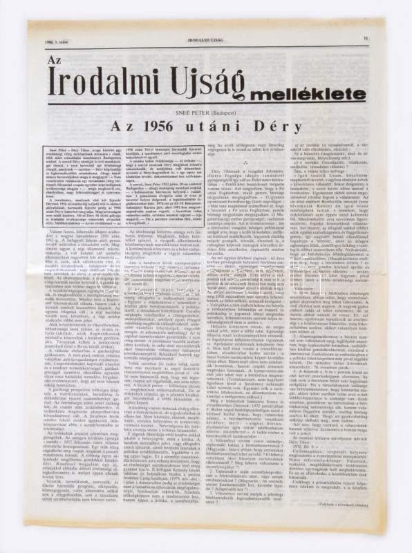 1986 Az Irodalmi Ujság. Szerk.: Méray Tibor. Benne: Az Irodalmi Újság mellélete: Sneé Péter Az 1956 utáni Déry. XXXVII. évfolyam, 1986 1. szám. Kiadói papírkötés, jó állapotban.