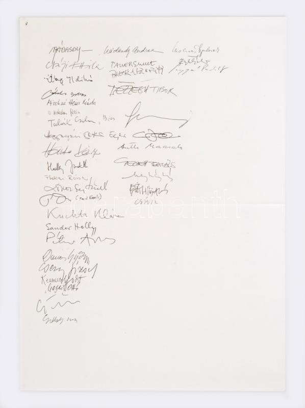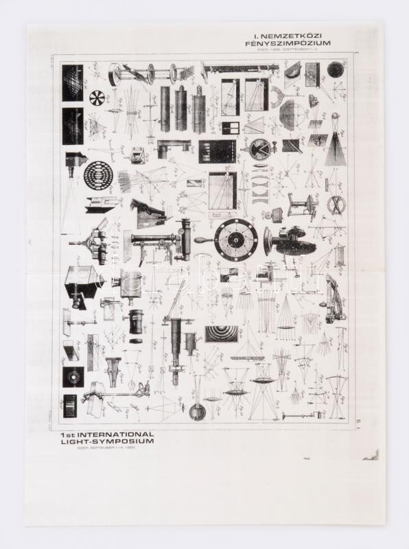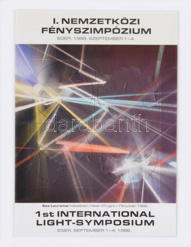 1996 I. Nemzetközi Fényszimpózium plakátja és kiállítási meghívója, a plakát hátulján a kiállításon szereplő résztvevő előadók, művészek aláírásaival (Cserny József (1939-2009), Nádasdy Ferenc (1937-2013), Csáji Attila (1939-), Hatos Károly (1955-) ...stb.), 42x30 cm.