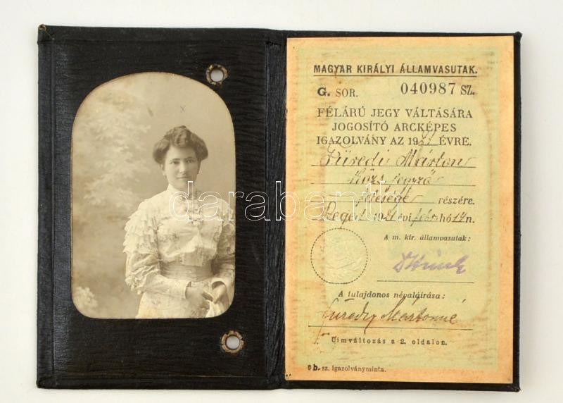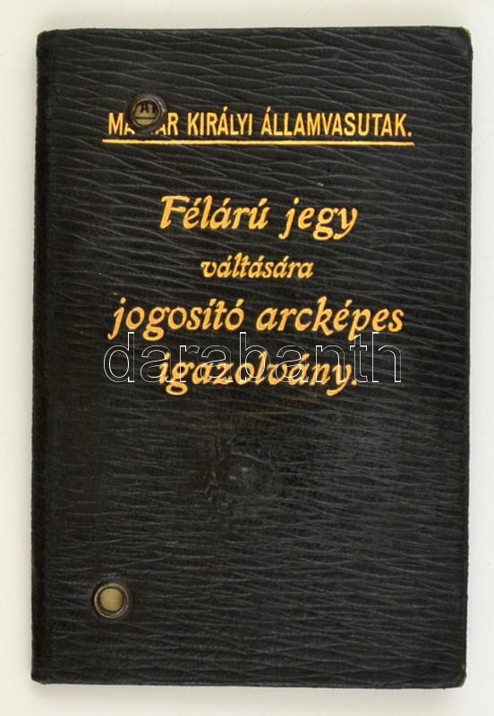 Leírás: 1921 Magyar Királyi Államvasutak féláru-jegy váltására jogosító arcképes igazolványa, bőr tokban
