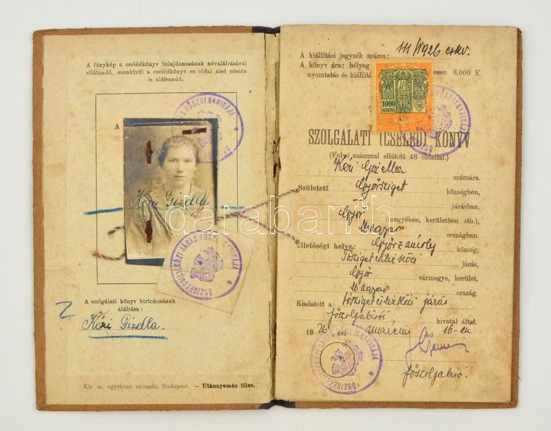 1926 Győrzámoly, Fényképes szolgálati cselédkönyv, 1000 kr. okmánybély... https://www.darabanth.com/hu/299-Gyorsarveres/299.0/Festmeny-mutargy-papirregiseg-egyeb/Okmanyok~17/1926-Gyorzamoly-Fenykepes-szolgalati-cseledkonyv-1000-kr-okmanybelyeggel-Hungarian-mai~II1601727