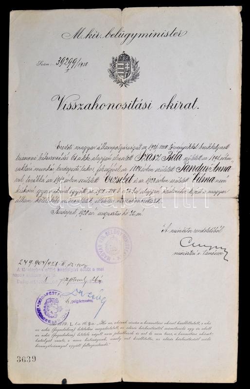 1928 Visszahonosítási okirat, M. Kir. Belügyminisztérium által kiállít... https://www.darabanth.com/hu/299-Gyorsarveres/299.0/Festmeny-mutargy-papirregiseg-egyeb/Okmanyok~17/1928-Visszahonositasi-okirat-M-Kir-Belugyminiszterium-altal-kiallitva-pecsettel-alair~II1538775