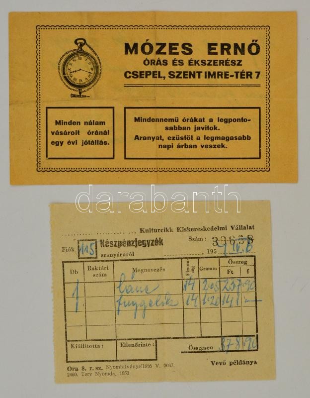 Leírás: 1938, 1954 Mózes Ernő órás és ékszerész valamint a Kulturcikk Kiskereskedelmi Vállalat által kiállított nyugta, 2 db