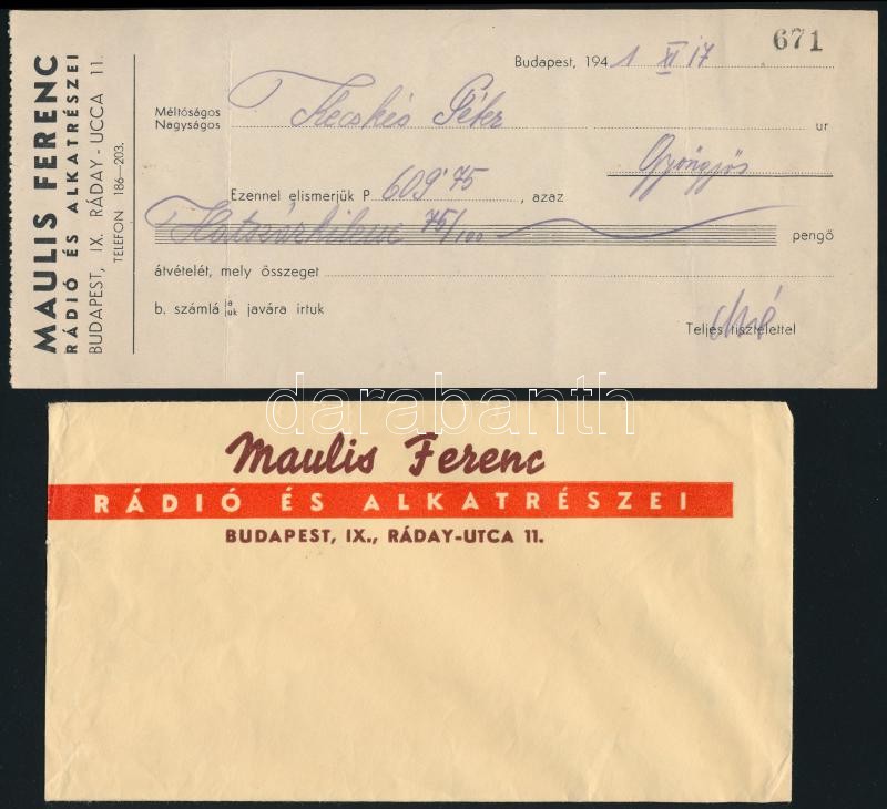 Leírás: 1941 Maulis Ferenc rádió és alkatrész kereskedés fejléces számla + boríték