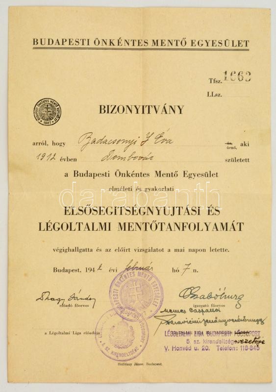 1942 Bp., A Budapesti Önkéntes Mentő Egyesület által kiállított elsőse... https://www.darabanth.com/hu/299-Gyorsarveres/299.0/Festmeny-mutargy-papirregiseg-egyeb/Okmanyok~17/1942-Bp-A-Budapesti-Onkentes-Mento-Egyesulet-altal-kiallitott-elsosegelynyujtasi-es-lC3~II1600373