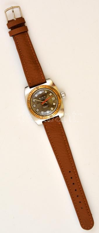Leírás: Elgin automata karóra, 25 köves, naptárral, bőr szíjjal, működő, jó állapotban / Automatic watch. Works well.