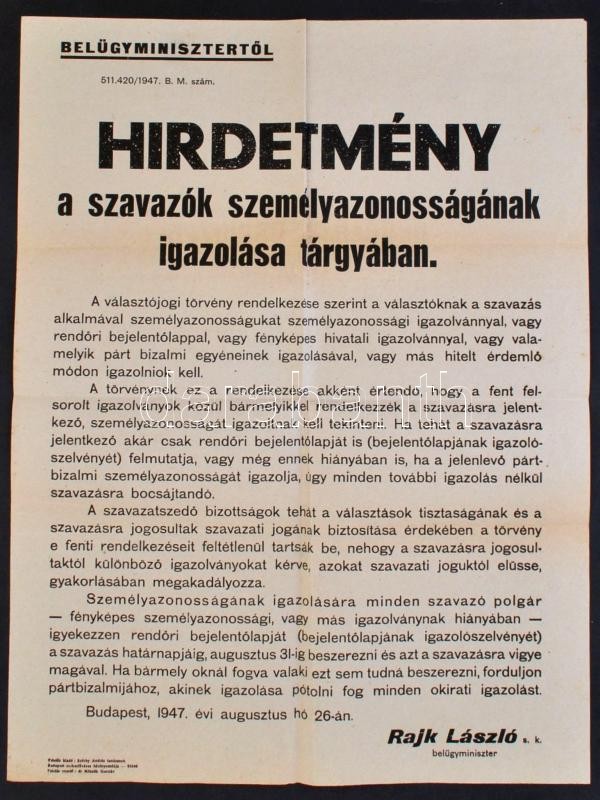 Leírás: 1947 A "kékcédulás" választás plakátja szép állapotban 42x60 cm