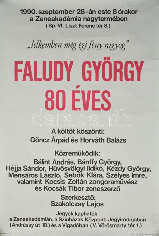 1990 Faludy György 80 éves, ünnepség a Zeneakadémián, plakát, 83x58 cm https://www.darabanth.com/hu/299-Gyorsarveres/299.0/Festmeny-mutargy-papirregiseg-egyeb/Plakat~500096/1990-Faludy-Gyorgy-80-eves-unnepseg-a-Zeneakademian-plakat-83x58-cm~II1579373