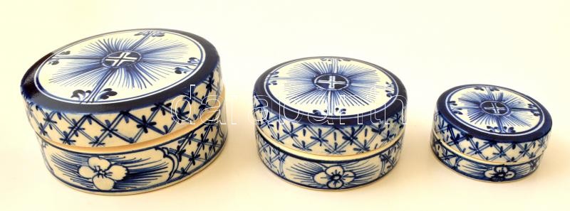 Leírás: 3 db kékfestéses fajansz "matrjoska"-edényke, jelzés nélkül, apró kopásokkal, d: 7-11,5 cm