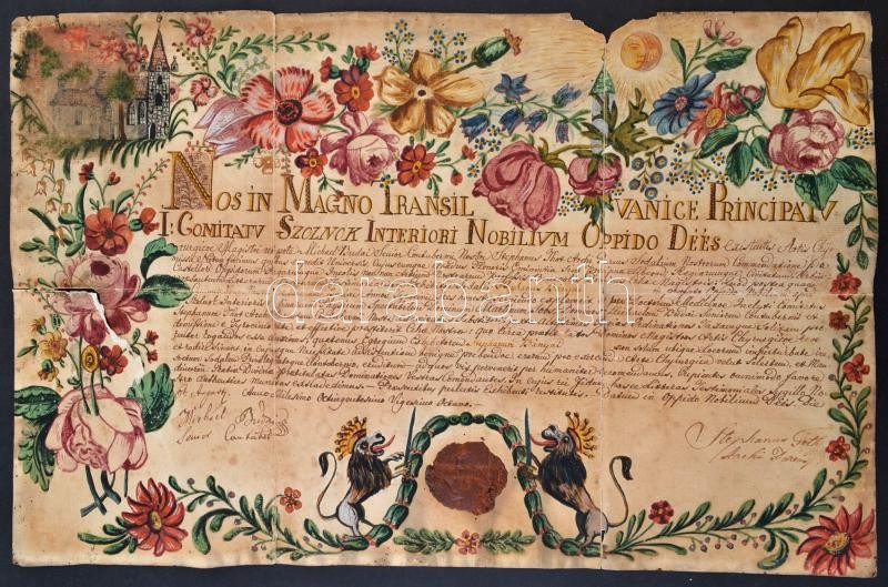 1828 Sebész orvos, kirurgus szabaduló levele. Dési sebész céh kézzel rajzolt oklevele, rajzolt városképpel. Szakadozott állapotban 50x65 cm /