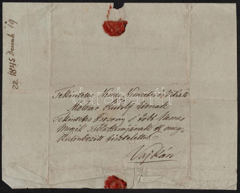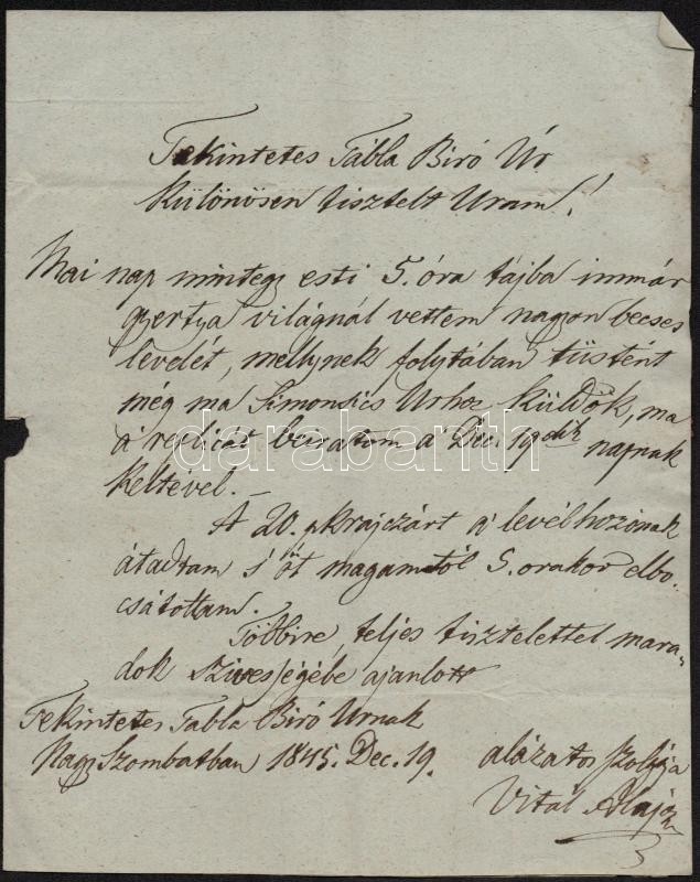 Leírás: 1843 alszászi Vitál Alajos bűvész, jogász író saját kézzel írt levele pozsonyi táblabírónak