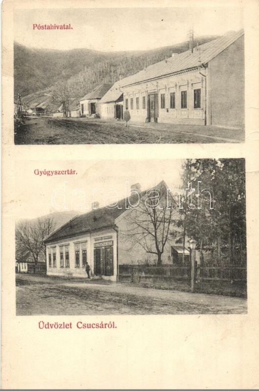 Leírás: Csucsa, Ciucea; Postahivatal, Gyógyszertár / post office, pharmacy (fa)