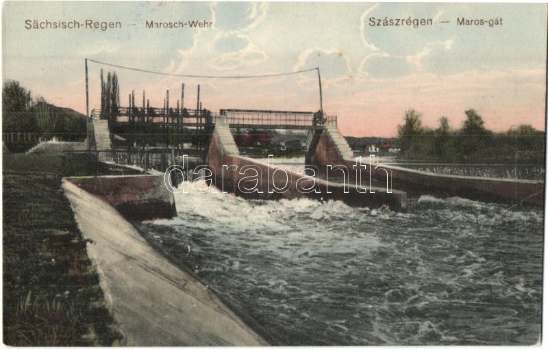 Szászrégen, Reghin; Marosch-Wehr / Maros gát, Erich Fabritius & Comp. kiadása / dam, river + K.u.K. Husaren-Regiment Friedrich Wilhelm III. König von Preussen Nr. 10. 4. Eskadron (EB)
