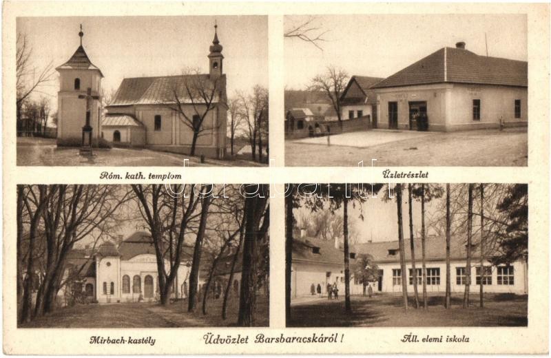 Barsbaracska, Bardonovo; Római Katolikus templom, üzlet, vendéglő, Mirbach-kastély, Állami elemi iskola, Kozlov Sándor kiadása / church, shop, castle, school