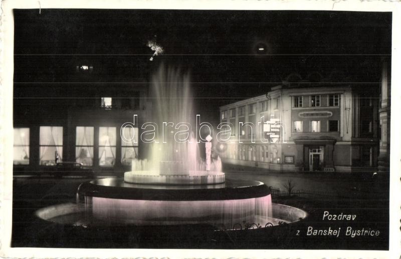 Besztercebánya, Banska Bystrica; utcakép este, szökőkút, automobil, Fiatalok Keresztény Egyesülete háza / street view at night, fountain, automobile, YMCA building, photo (EK)