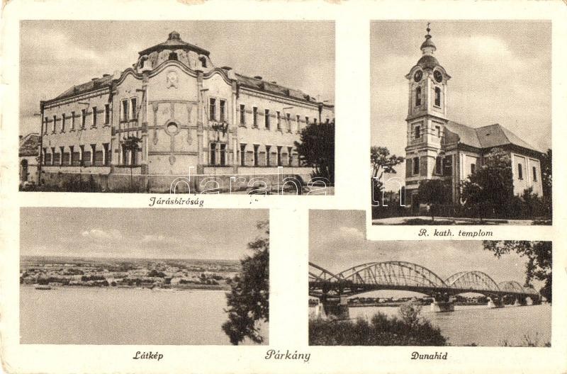 Párkány, Stúrovó; Járásbíróság, Római katolikus templom, látkép, Dunahíd, Gárdony és Fenyvesi kiadása / court, church, general view, bridge (kis szakadás / small tear)