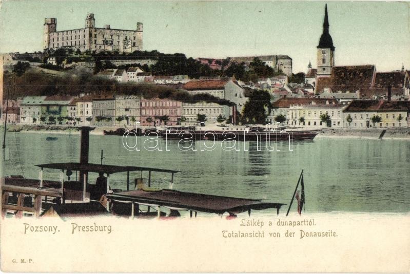 Pozsony, Pressburg, Bratislava; Dunapart, vár, gőzhajók / river bank, ... https://www.darabanth.com/hu/299-Gyorsarveres/299.0/Kepeslapok/Felvidek~500009/Pozsony-Pressburg-Bratislava-Dunapart-var-gozhajok-river-bank-steamships-castle~II1600402