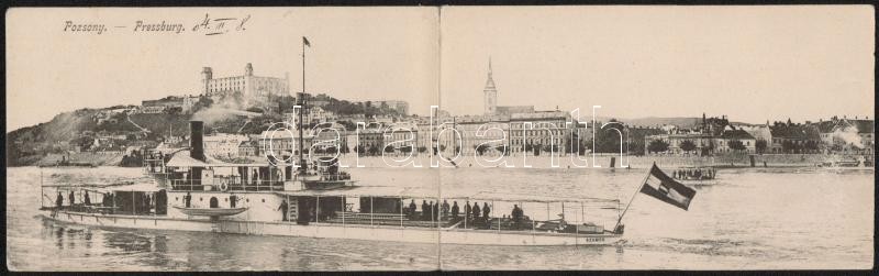 Dunaflottilla. Szamos monitor és legénysége Pozsonynál, háttérben a vár. Kihajtható képeslap / Donauflottille / K.u.K. Kriegsmarine river guard ship and it's crew by Bratislava, Pressburg. folding card (r)