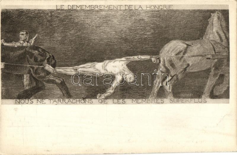 4 db régi irredenta művészi motívumlap, 2 Némethy Miklós ciklusából (II. kép Demarkációs vonal Magyarországon, III. kép Fegyverszünet) és 2 Unghváry Sándor Magyarország feldarabolása ciklusból (I. és III. kép) / 4 pre-1945 Hungarian irredenta motive art postcards