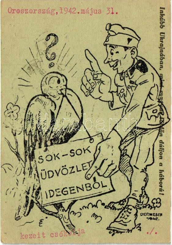 1942 Inkább Ukrajnában, mint magyar földön dúljon a háború! Sok-sok üdvözlet idegenből! Második világháborús tábori posta, humoros grafika / WWII Hungarian humorous, graphic military field post s: Dermesch (EK)