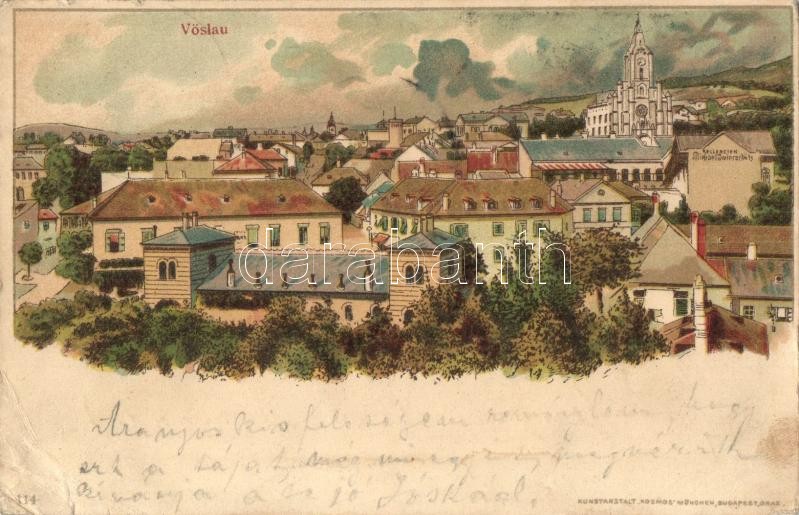 6 db régi európai városképes lap, közte 1 litho / 6 pre-1945 European town-view postcards, Wien, Gorizia, Vöslau, Steinabrück, among them 1 litho Art Nouveau