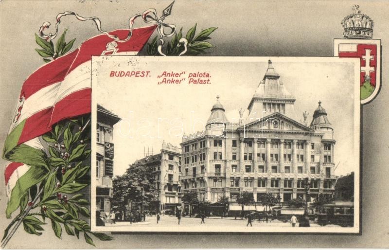 Budapest V. Anker palota, villamos, Magyar zászlós és címeres keret https://www.darabanth.com/hu/299-Gyorsarveres/299.0/Kepeslapok/Magyarorszag~500007/Budapest-V-Anker-palota-villamos-Magyar-zaszlos-es-cimeres-keret~II1601323