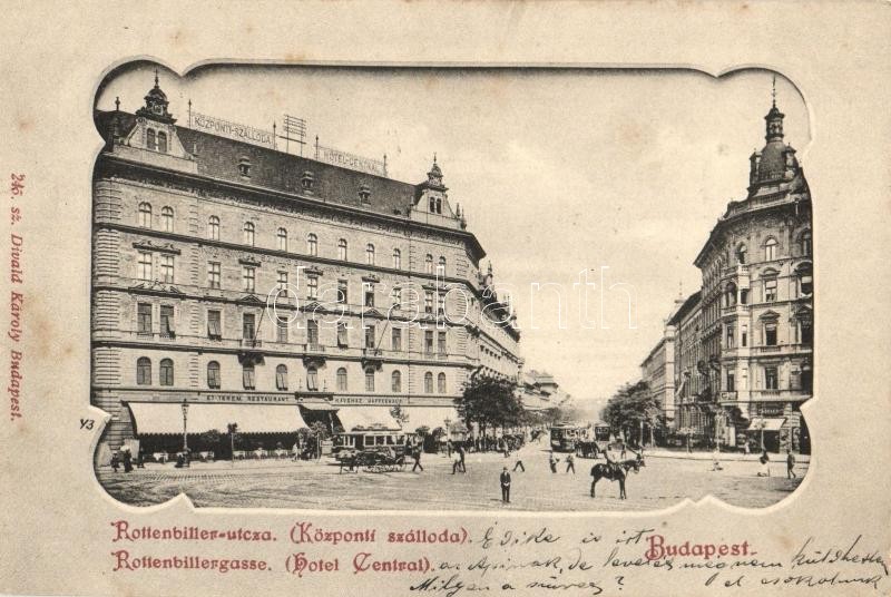 Leírás: Budapest VII. Rottenbiller utca, Központi szálloda, villamosok. Divald Károly 246.