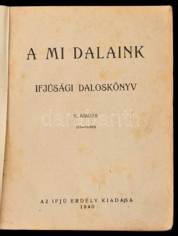 A mi dalaink. Ifjúsági daloskönyv. Kolozsvár, 1940, Ifjú Erdély, 201+7 p. V. kiadás. Papírkötésben, kissé kopottas, kissé foltos borítóval, néhol ceruzás bejelöléssel.
