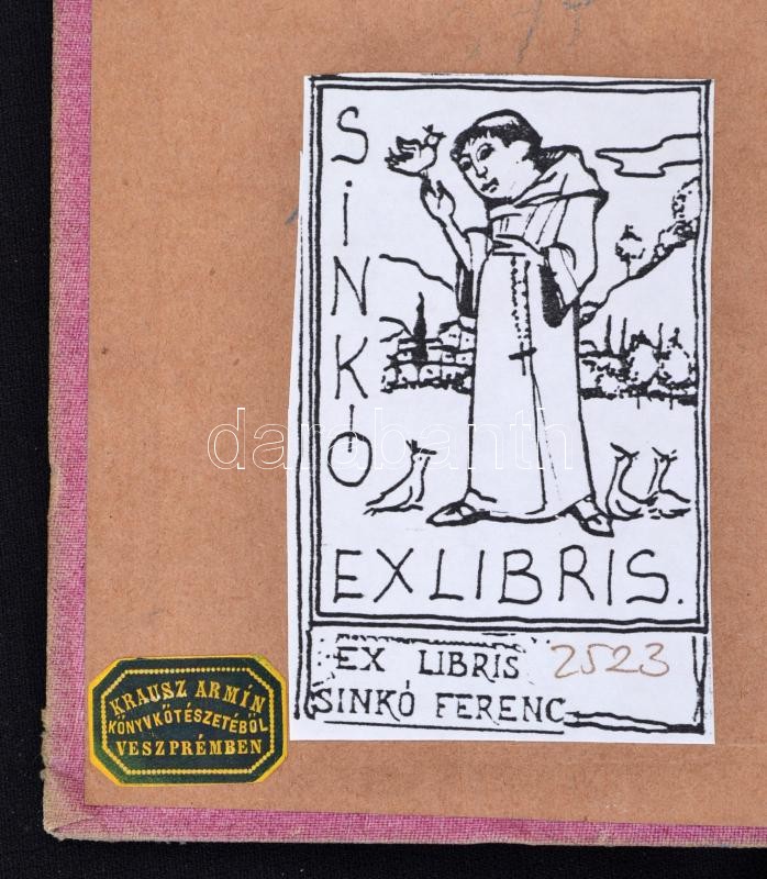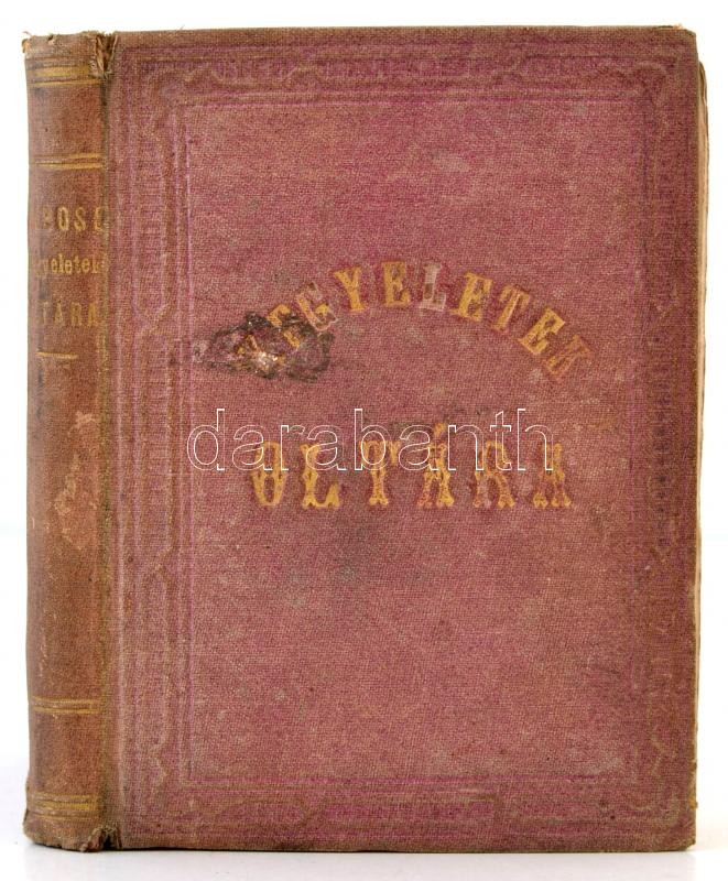 Leírás: Boross Mihály: Kegyeletek oltára. Boross Mihály munkái I. kötet 1. füzet II. kötet 1. füzet. Pest, 1859, Oszterlamm Károly, 94+102+2 p. Könyvkötői aranyozott egészvászon-kötés, Krausz Ármin könyvkötészetéből (Veszprém), kopottas, foltos borítóval, hiányzó elülső szennylappal, foltos lapokkal, Sinkó Ferenc (1912-1990) író ex libris-szével.