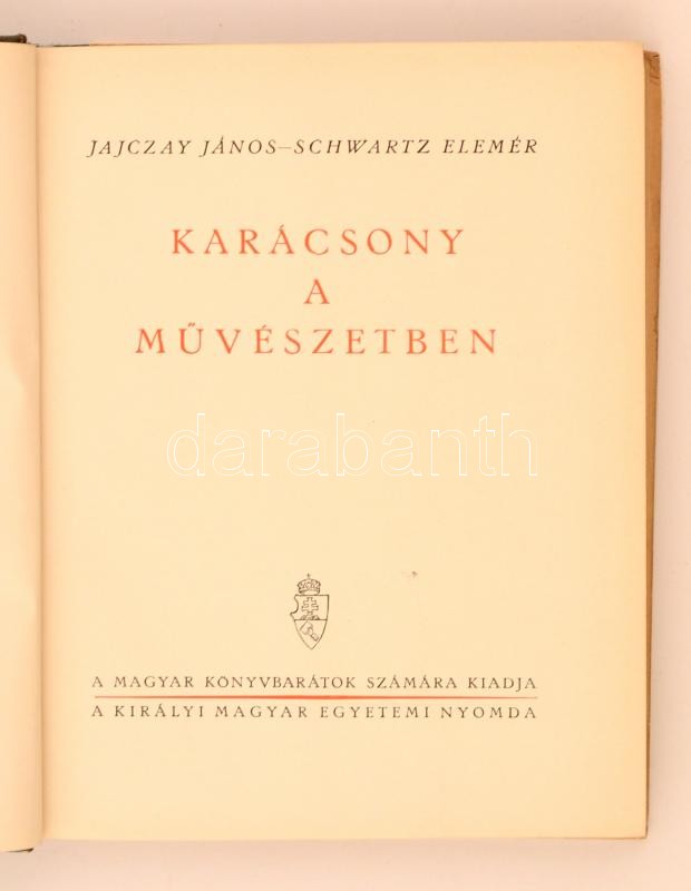 https://www.darabanth.com/hu/299-Gyorsarveres/299.0/Konyvek/Konyvek-Egyeb-ritkasagok~200016/Jajczay-Janos-Schwartz-Elemer-Karacsony-a-muveszetben-Budapest-1942-Kir-M-Egyetemi-Ny-~II1421167