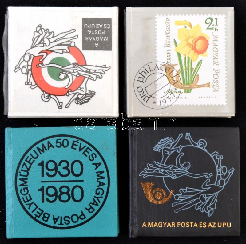 Vegyes minikönyv tétel, 4 db: Pro Philatelia. Az ötvenedik magyar bélyegnap alkalmából. Bp., 1977, Magyar Posta. Kiadói műbőr kötés. Számozatlan példány. 50 éves a Magyar Posta Bélyegmúzeuma. 1930-1980. Szerk.: Bosits Lászlóné. Bp., 1980, Magyar Posta. Kiadói műbőr kötés. Számozatlan példány. A magyar posta és az upu. Budapest, 1979, Magyar Posta. Kiadói egészvászon kötés, illusztrációkkal, magyar, francia, orosz, angol, és spanyol nyelven. Számozatlan példány. Jó állapotban. A magyar posta és az upu. Budapest, 1979, Magyar Posta. Kiadói egészvászon kötés, illusztrációkkal, magyar, francia, orosz, angol, és spanyol nyelven. Számozott (250/016.) példány, piros számozással. Jó állapotban.