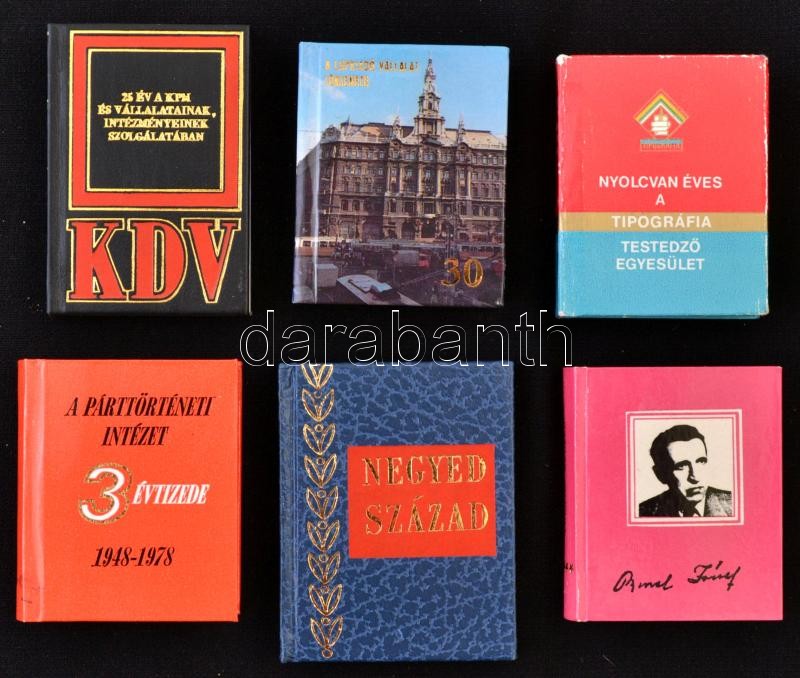 Vegyes minikönyv tétel, 6 db: Negyed század. A Lapkiadó Vállalat története. Szerk.: Hámori Ottó. Budapest, 1977, Lapkiadó Vállalat. Kiadói műbőr kötés, fekete-fehér fotókkal. Harminc év. Fejezetek a Lapkiadó Vállalat történetébőé. Szerk.: Haynal Kornél. Budapest, 1981, Lapkiadó Vállalat. Kiadói kemény papírkötés, fekete-fehér fotókkal. 25 év a KPM és vállalatainak, intézményeinek szolgálatában. Bp., 1975, Közlekedési Dokumentációs Vállalat. Kiadói műbőr-kötés. Nyolcvan éves a Tipográfia Testedző Egyesület. 1903-1983.Tíz év története. Bp.,1983, Tipográfia TE. Kiadói kartonált papírkötés. Készült 1200 példány. A Párttörténeti Intézet 3 évtizede 1948-1978. Bp., 1978, Kossuth. Számozott (500/95.) példány. Kiadói kartonált papírkötés. Tarján István: Viharos évtizedek - Prieszol József élete. Miskolc, 1981. Miniatűr Könyvgyűjtők Klubja. Számozott (600/192.) példány. Kereskedelmi forgalomba nem került.