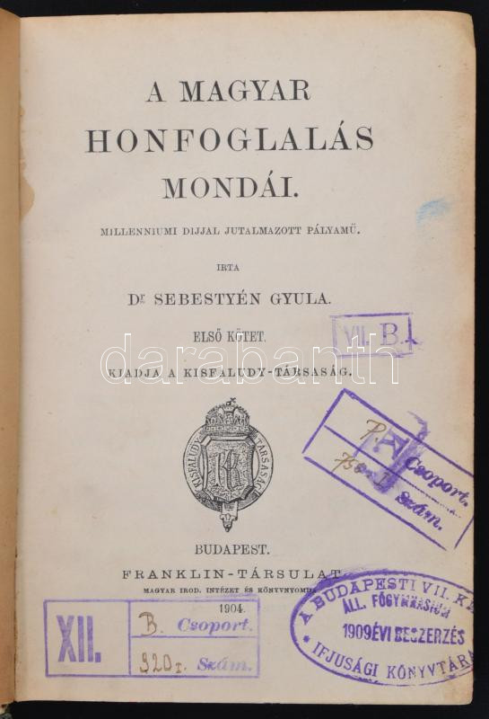 Dr. Sebestyén Gyula: A magyar honfoglalás mondái I. Bp., 1904, Franklin, XX+563 p. Átkötött kopottas egészvászon-kötés, intézményi bélyegzőkkel, márványozott lapélekkel.