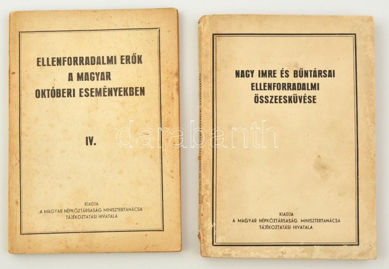 Ellenforradalmi erÅ‘k a magyar októberi eseményeken IV. Kiadja a Magyar Népköztársaság Minisztertanácsa Tájékoztatási Hivatala. Kiadói papÃrkötés, kopottas állapotban + Nagy Imre és bűntársai ellenforradalmi összeesküvése. Kiadja a Magyar Népköztársaság Minisztertanácsa Tájékoztatási Hivatala. Kiadói papÃrkötés, kopottas állapotban.