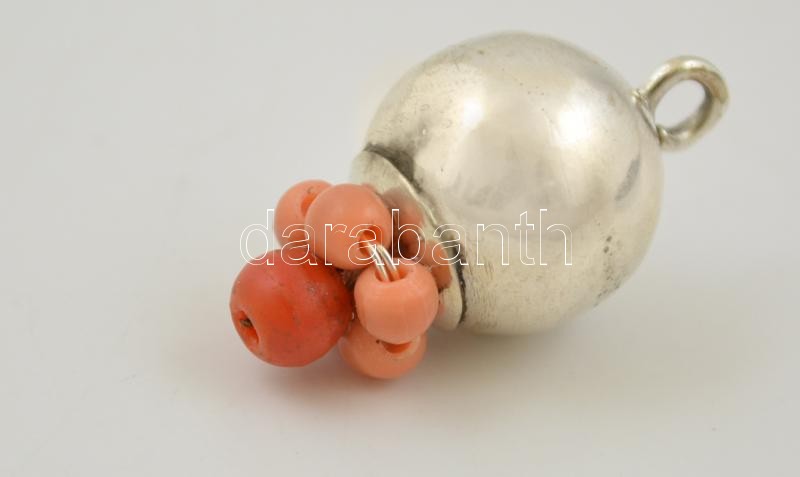 Leírás: Ezüst(Ag) díszgomb, korall díszítéssel, jelzés nélkül, h: 2,5 cm, bruttó: 4,3 g