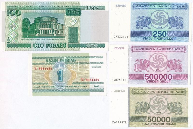 Leírás: Vegyes: Grúzia 1993. 250L biztonsági csíkkal + 1994. 50.000L + 500.000L + Fehéroroszország 2000. 1R + 100R T:I,I-