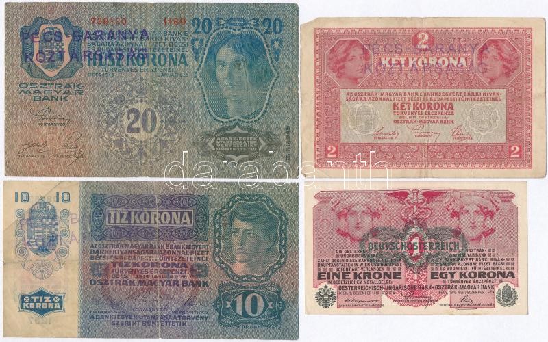 Leírás: 1913. 20K + 1915. 10K + 1916. 1K + 1917. 2K mindegyik hamis "Pécs-Baranya Köztársaság" felülbélyegzéssel (fake overprint) T:II,III,III-