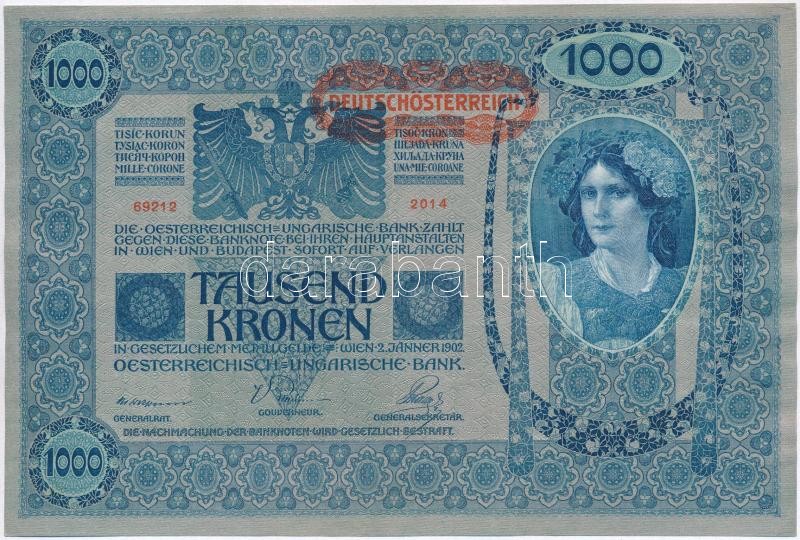 1919. (1902) 1000K vízszintes piros "DEUTSCHÖSTERREICH" felü... https://www.darabanth.com/hu/299-Gyorsarveres/299.0/Numizmatika/Magyar-bankjegyek~400007/1919-1902-1000K-vizszintes-piros-DEUTSCHOSTERREICH-felulbelyegzessel-hatlap-rajzos-TI-I~II1602059