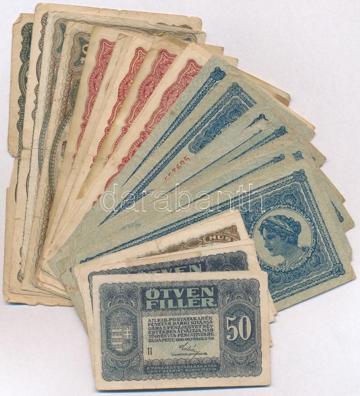 1920. 20f (2x) + 50f (2x) + 1K (14x) + 2K (11x) + 10K (2x) + 20K (2x) ... https://www.darabanth.com/hu/299-Gyorsarveres/299.0/Numizmatika/Magyar-bankjegyek~400007/1920-20f-2x-plus-50f-2x-plus-1K-14x-plus-2K-11x-plus-10K-2x-plus-20K-2x-TIII-III-~II1604820