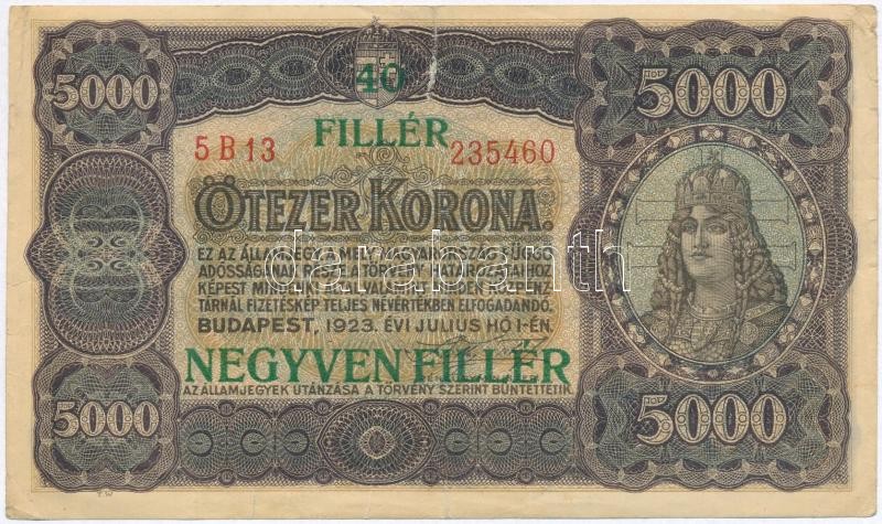 Leírás: 1923. 5000K "T.W." jelöléssel, nyomdahely jelölés nélkül "40 FILLÉR NEGYVEN FILLÉR" felülbélyegzéssel T:III- szakadás