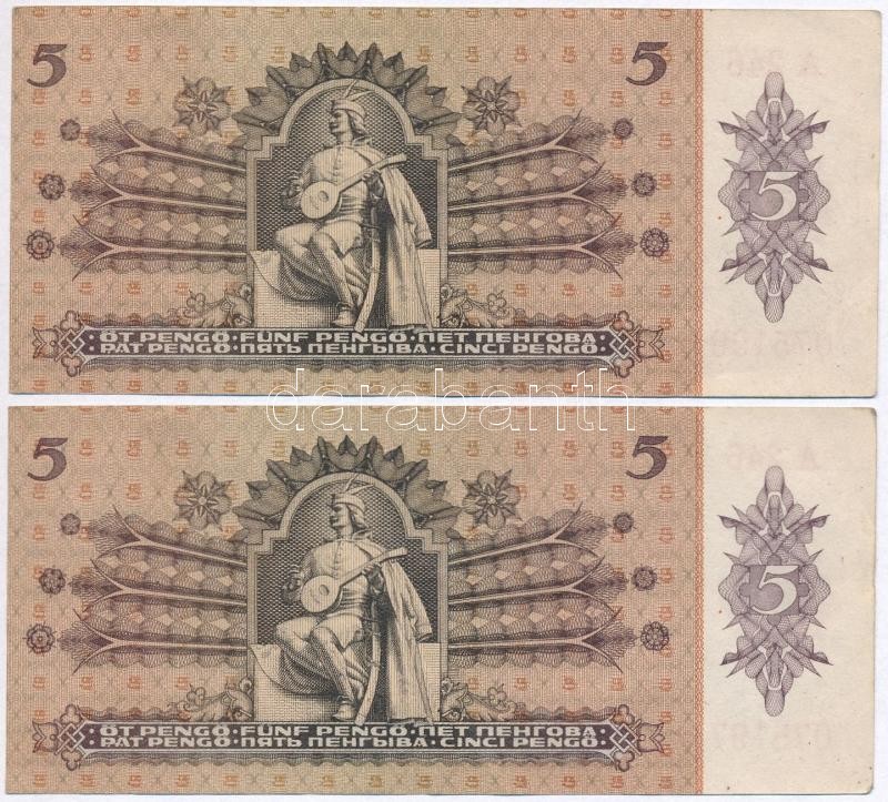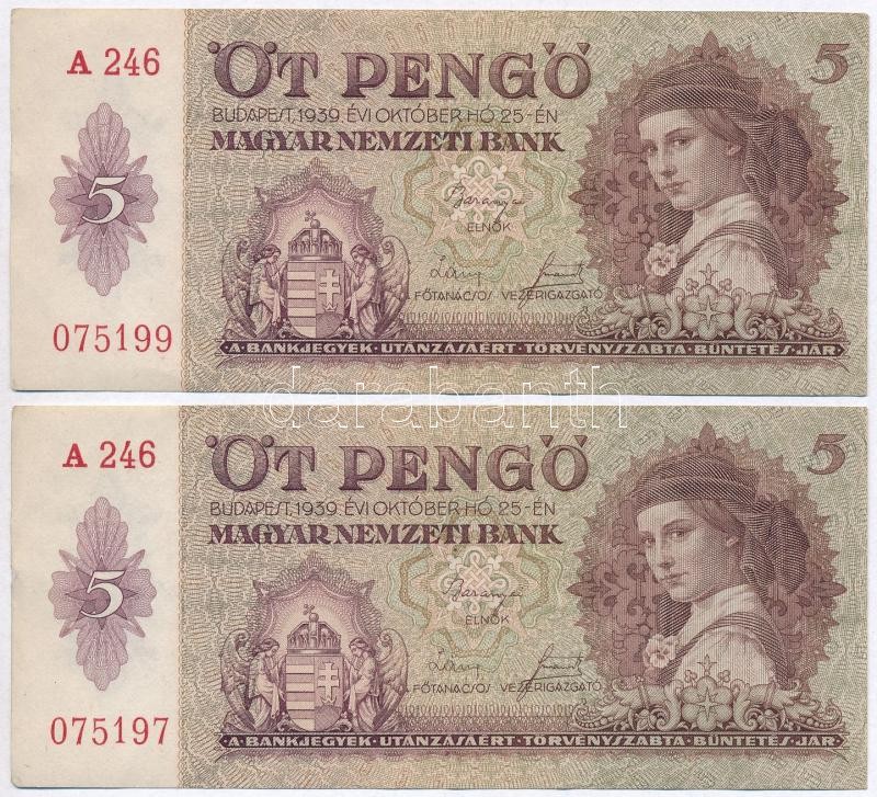 1939. 5P (2x) egyugrásos sorszámkövetők T:I-,II https://www.darabanth.com/hu/299-Gyorsarveres/299.0/Numizmatika/Magyar-bankjegyek~400007/1939-5P-2x-egyugrasos-sorszamkovetok-TI-II~II1602433