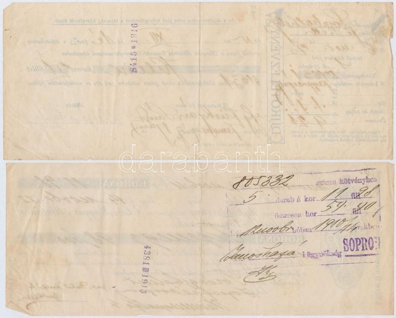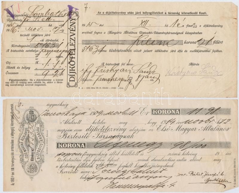 Leírás: Szombathely 1909-1915. "Első Magyar Általános Biztosító Társaság" díjkötelezvény bélyegzésekkel (2x) T:III