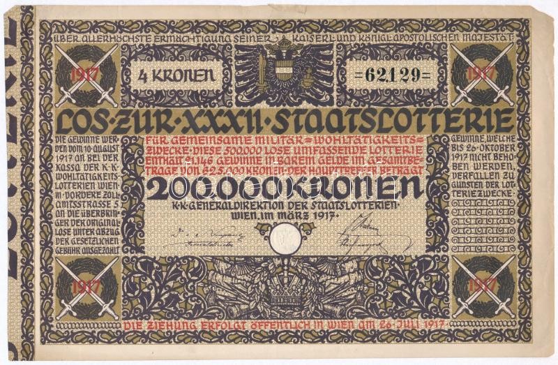 Ausztria / Bécs 1917. "XXXII. Staatslotterie" lottó sorsjegy... https://www.darabanth.com/hu/299-Gyorsarveres/299.0/Numizmatika/Reszvenyek-es-sorsjegyek~400005/Ausztria-Becs-1917-XXXII-Staatslotterie-lotto-sorsjegy-4K-ertekben-szarapecsettel-TII-~II1599477