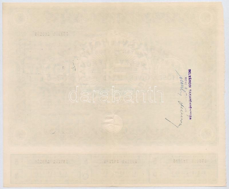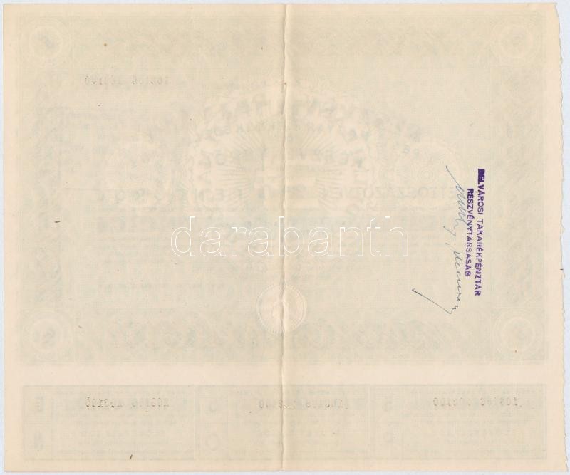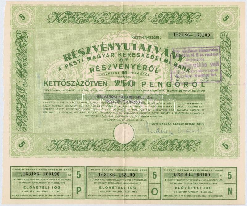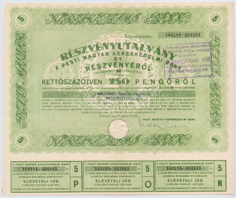 Budapest 1946. "Pesti Magyar Kereskedelmi Bank" részvényutalvány 5 részvényről egyben, összesen 250P-ről, szárazpecséttel, bélyegzéssel, szelvényekkel, sorszámkövetők (2x) T:II,II-