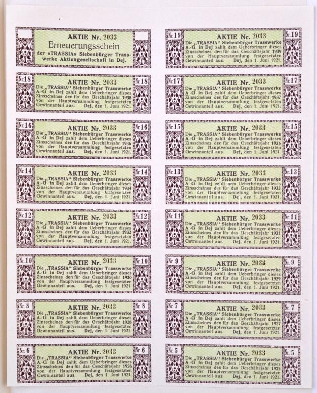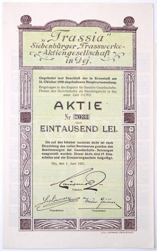 Románia / Dés 1921. "Trassia Siebenbürger Trasswerke Aktiengesellschat in Dej ('Trassia' Erdélyi Tufaművek Részvénytársaság, Dés)" részvény 1000L-ről, szelvényekkel T:I,I- / Romania / Dej "Trassia Siebenbürger Trasswerke Aktiengesellschat in Dej" Transylvanian Trassworks Company's share about 1000 Lei with coupons C:UNC,AU