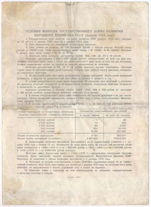 Soviet Union 1954. 100 Rubles l... https://www.darabanth.com/hu/299-Gyorsarveres/299.0/Numizmatika/Reszvenyek-es-sorsjegyek~400005/Szovjetunio-1954-100R-sorsjegy-TIII--Soviet-Union-1954-100-Rubles-lottery-ticket-CF~II1599124