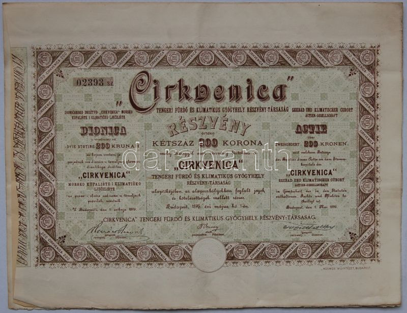 1895 Cirkvencia tengeri fürdő és klimatikus gyógyhely Rt. 200K részvén... https://www.darabanth.com/hu/3-Nagyaukcio/3.1/Numizmatika/Tortenelmi-ertekpapirok-Historische-Wertpapiere~899/1895-Cirkvencia-tengeri-furdo-es-klimatikus-gyogyhely-Rt-200K-reszveny-Seebad-und-Klimatisc~II67715