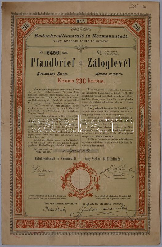 1895 Nagyszebeni Földhitelintézet 200K záloglevél / Pfandbrief https://www.darabanth.com/hu/3-Nagyaukcio/3.1/Numizmatika/Tortenelmi-ertekpapirok-Historische-Wertpapiere~899/1895-Nagyszebeni-Foldhitelintezet-200K-zaloglevel-Pfandbrief~II67685