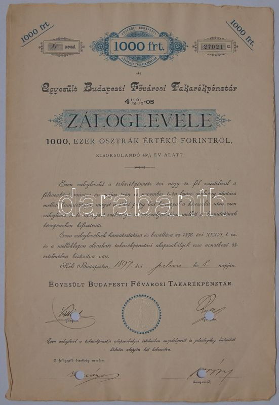 1897 Egyesült Budapesti Fővárosi Takarékpénztár 1000Ft záloglevél / Pf... https://www.darabanth.com/hu/3-Nagyaukcio/3.1/Numizmatika/Tortenelmi-ertekpapirok-Historische-Wertpapiere~899/1897-Egyesult-Budapesti-Fovarosi-Takarekpenztar-1000Ft-zaloglevel-Pfandbrief~II67686