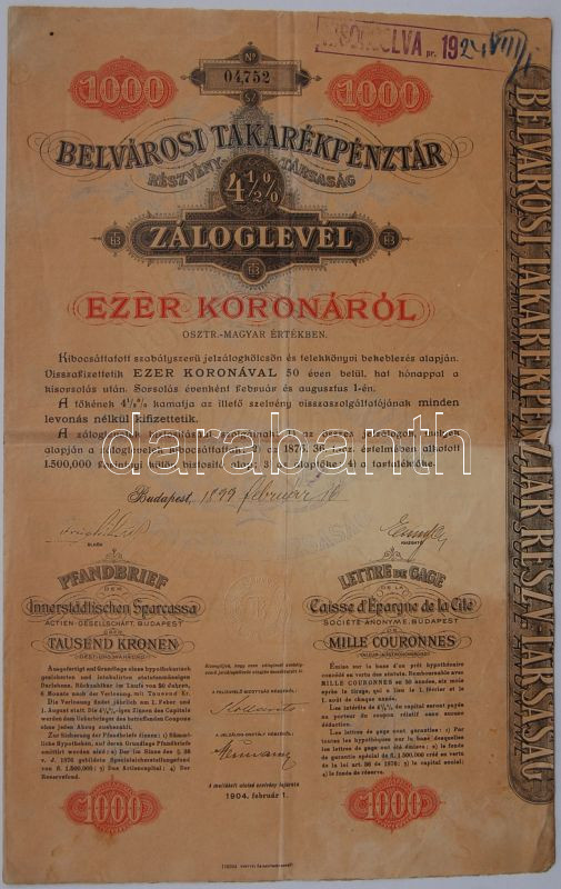 1899 Belvárosi Takarékpénztár 1000K záloglevél / Pfandbrief https://www.darabanth.com/hu/3-Nagyaukcio/3.1/Numizmatika/Tortenelmi-ertekpapirok-Historische-Wertpapiere~899/1899-Belvarosi-Takarekpenztar-1000K-zaloglevel-Pfandbrief~II67682