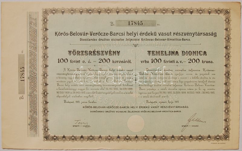 1912 Kőrös-Belovár-Verőcze-Barcsi helyi érdekű vasút 200K részvény / K... https://www.darabanth.com/hu/3-Nagyaukcio/3.1/Numizmatika/Tortenelmi-ertekpapirok-Historische-Wertpapiere~899/1912-Koros-Belovar-Verocze-Barcsi-helyi-erdeku-vasut-200K-reszveny-Krizevac-Belovar-Virov~II67708